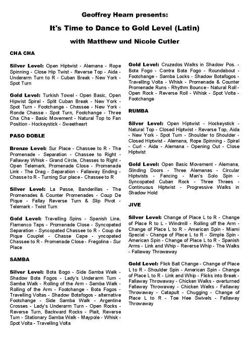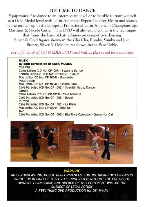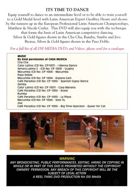 Geoffrey Hearn hat die Silber und Gold-Level-Figuren in elf interessanten Folgen in den fünf Lateintänzen zusammengestellt, die von den Amateur Weltmeistern Matthew und Nicole Cutler gezeigt werden. Außerdem wird die Technik gezeigt, die die Grundlage der lateinamerikanischen Turniertänze bildet. Details siehe Abbildung.