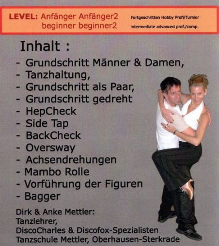 Dirk & Anke Mettler zeigen alle Grundfiguren des neuen Modetanzes „DiscoCharles“. Details siehe Abbildung.