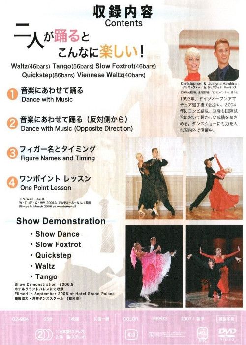 Christopher & Justyna Hawkins zeigen 46 Takte Slow Waltz Choreographie, 56 Takte Tango Choreographie, 46 Takte Slow Foxtrot Choreographie, 86 Takte Quickstep Choreographie und 40 Takte Wiener Waltz Choreographie - getanzt mit Musik in verschiedene Richtungen, einschließlich Figuren-Namen und Timing mit einer 'One Point Lektion'.